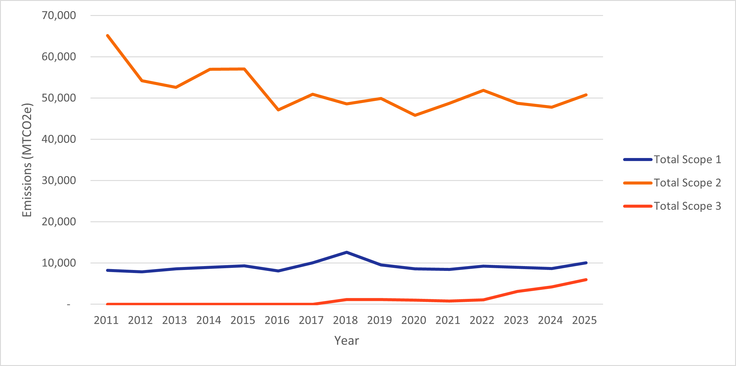 Below is a line graph depicting Syracuse University’s emissions measured in metric tons of carbon dioxide equivalent (MTCO2e). Note, scope 3 emissions were not accounted for until 2017. Overall, there has been a 20% reduction in greenhouse gas emissions in 2024 compared to 2011 levels.
